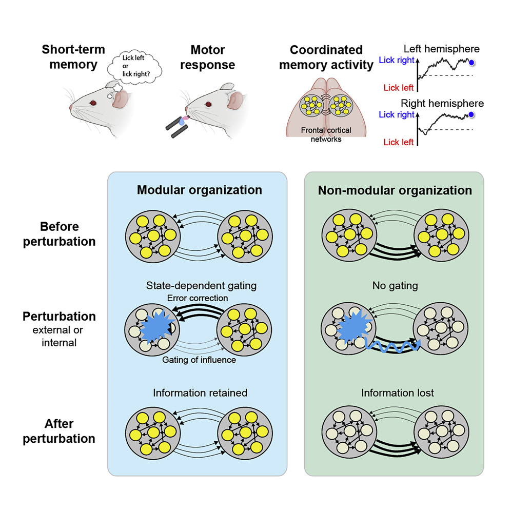 在整个小鼠实验中,研究人员发现了额叶皮层网络组织的个体差异性。持续性活动对扰动的稳健性需要有一个模块化的组织:每个脑半球在另一个半球受到扰动时保留持续性活动,从而防止局部扰动的扩散。一个动态的门控机制允许脑半球协调一致的信息,同时门控出损坏的信息。
