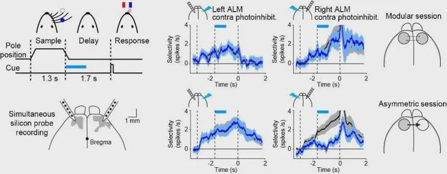 本研究在小鼠执行短时记忆行为任务的时候,同时对其大脑两侧前额皮层进行了大规模「神经元群体电活动」的记录以及「光遗传学扰动」。