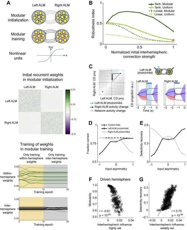 研究表明,要想神经网络在该短时记忆任务中拥有稳健的表现需要满足三个基本条件,即两侧皮层网络间连接的模块化初始,模块化训练以及神经元的非线性特性。